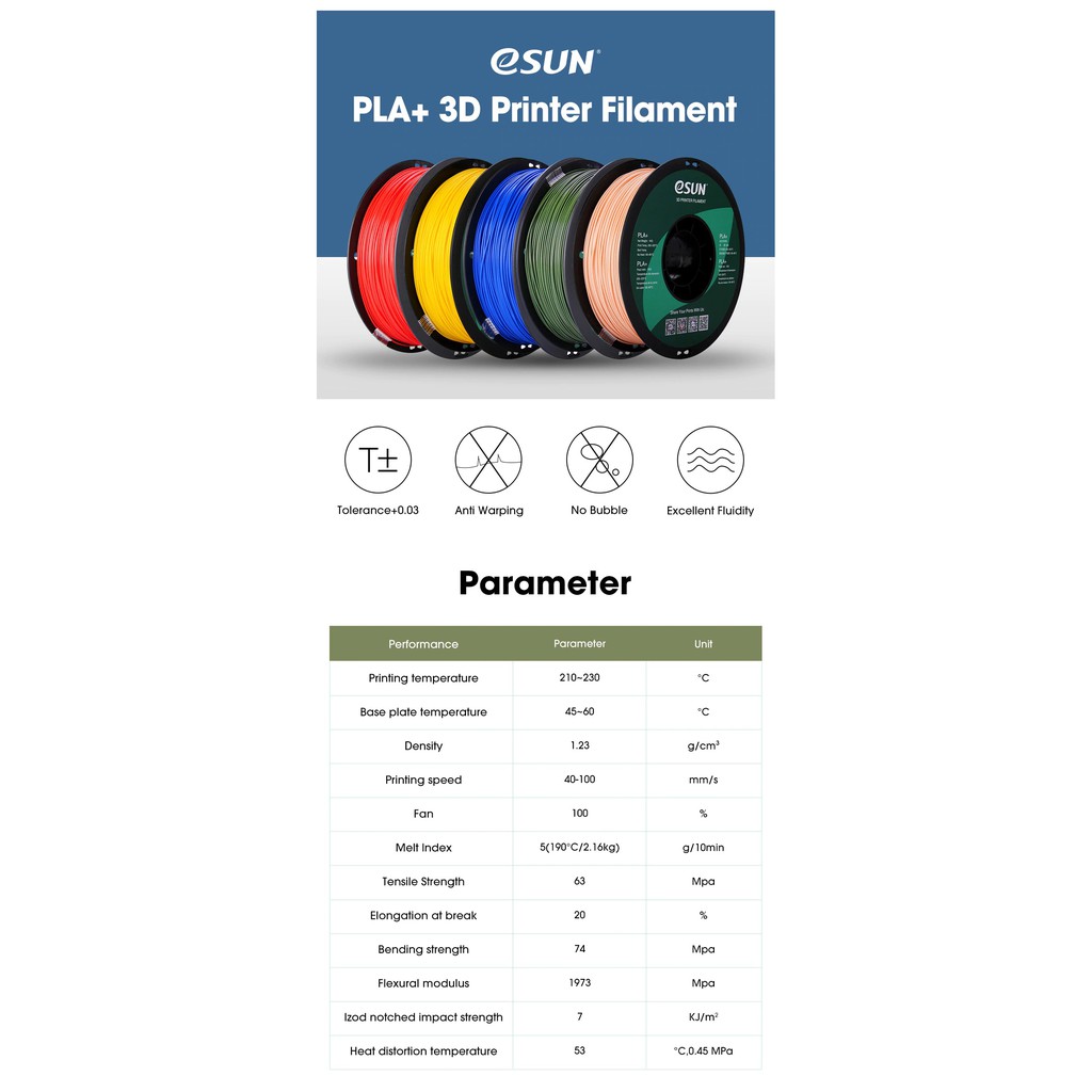 Es bestitzt eine gute materialzähigkeit und eine gute festigkeit. Esun 3d new optimized pla+ 3d printing filament. So for the hatchbox pla i used the heated bed at 50c , extruder at 190c and got excellent results.. No other filament has ever had these issues with my printers so i can rule that out.